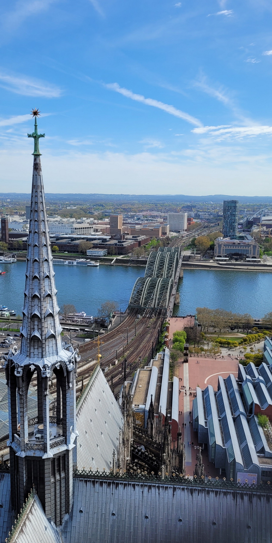 Du blickst über das Panorama der Stadt, siehst den silbrigen Rhein, der sich durch die Viertel schlängelt, und die bunten Dächer der Altstadt.