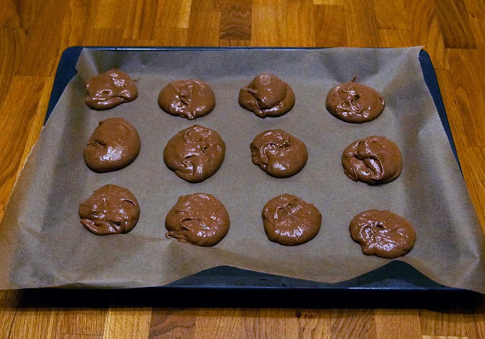 Hierbei solltest du auf ausreichende Abstände zwischen den Teigkleksen achten. Der Tag verläuft im Backofen und die Cookies werden größer. Wie du auf unseren Bildern sehen kannst, haben wir eigentlich keine Nutella-Cookies gebacken, sondern ein Nutella-Keks-Blech!
